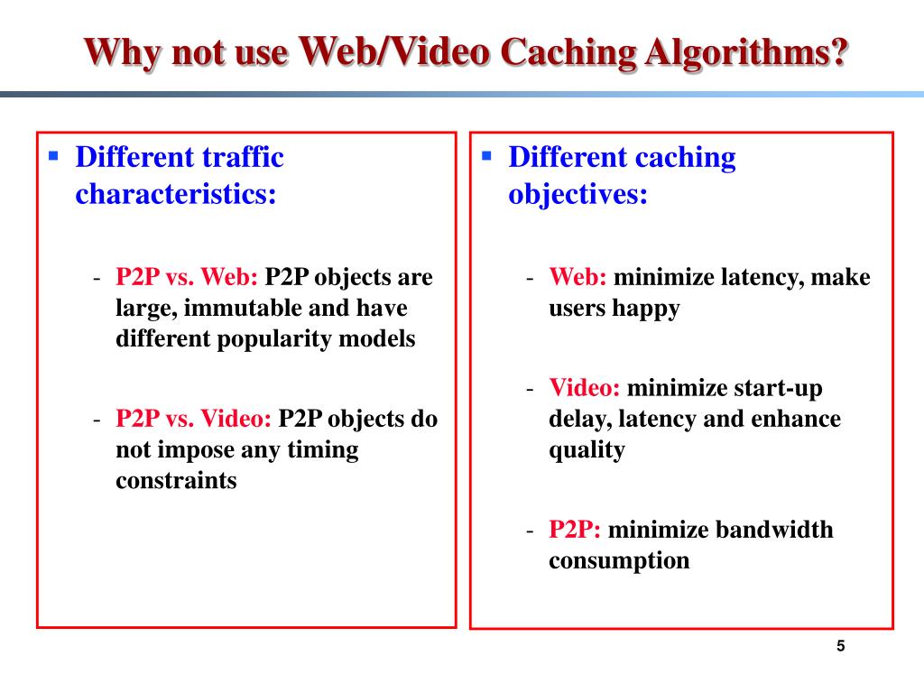 Different traffic characteristics: P2P vs. Web: P2P objects are large, immutable and have different popularity models P2P vs. Video: P2P objects do not impose any timing constraints Different caching objectives: Web: minimize latency, make users happy Video: minimize start-up delay, latency and enhance quality P2P: minimize bandwidth consumption Why not use Web/Video Caching Algorithms?