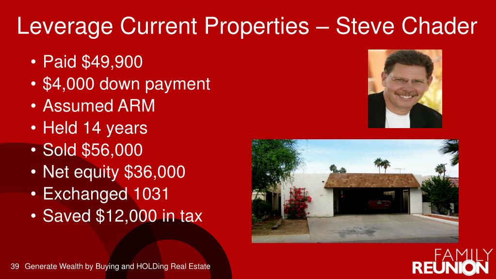 Leverage Current Properties – Steve Chader • Paid $49,900 • $4,000 down payment • Assumed ARM • Held 14 years • Sold $56,000 • Net equity $36,000 • Exchanged 1031 • Saved $12,000 in tax Generate Wealth by Buying and HOLDing Real Estate