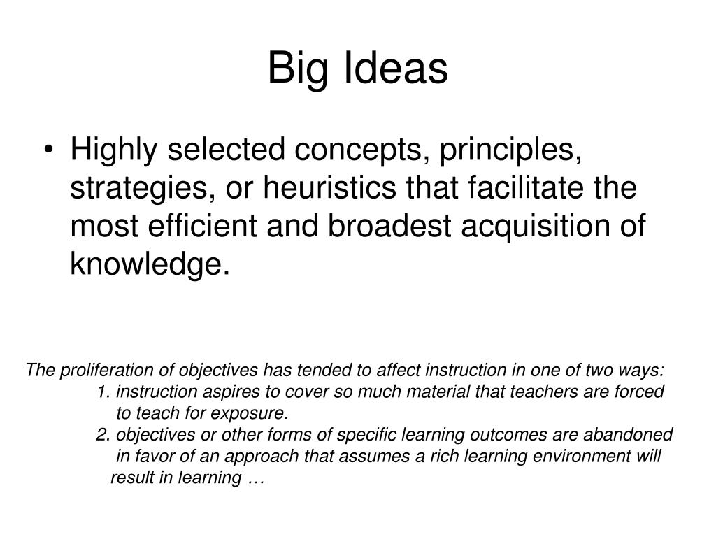 Big Ideas • Highly selected concepts, principles, strategies, or heuristics that facilitate the most efficient and broadest acquisition of knowledge. The proliferation of objectives has tended to affect instruction in one of two ways: 1. instruction aspires to cover so much material that teachers are forced to teach for exposure. 2. objectives or other forms of specific learning outcomes are abandoned in favor of an approach that assumes a rich learning environment will result in learning …