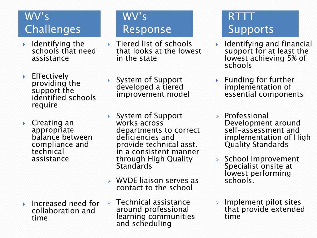 RTTT Supports • Tiered list of schools that looks at the lowest in the state • System of Support developed a tiered improvement model • System of Support works across departments to correct deficiencies and provide technical asst. in a consistent manner through High Quality Standards • WVDE liaison serves as contact to the school • Technical assistance around professional learning communities and scheduling • Identifying the schools that need assistance • Effectively providing the support the identified schools require • Creating an appropriate balance between compliance and technical assistance • Increased need for collaboration and time • Identifying and financial support for at least the lowest achieving 5% of schools • Funding for further implementation of essential components • Professional Development around self-assessment and implementation of High Quality Standards • School Improvement Specialist onsite at lowest performing schools. • Implement pilot sites that provide extended time WV’s Challenges WV’s Response
