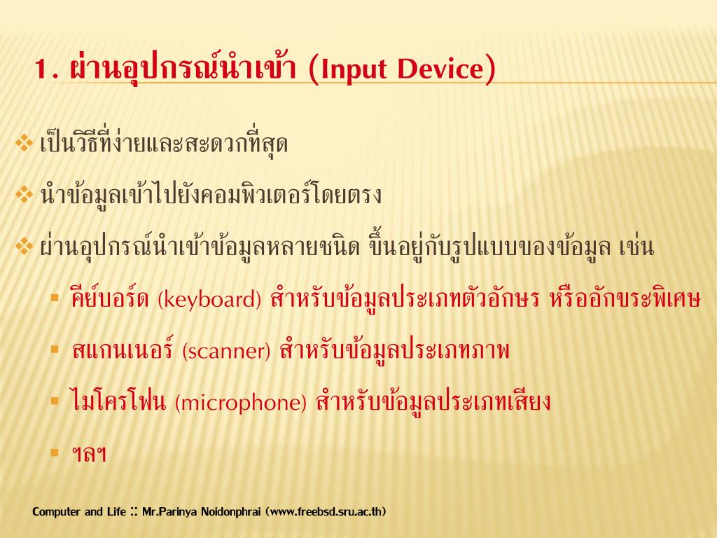 1. ผ่านอุปกรณ์นำเข้า (Input Device) เป็นวิธีที่ง่ายและสะดวกที่สุด นำข้อมูลเข้าไปยังคอมพิวเตอร์โดยตรง ผ่านอุปกรณ์นำเข้าข้อมูลหลายชนิด ขึ้นอยู่กับรูปแบบของข้อมูล เช่น คีย์บอร์ด (keyboard) สำหรับข้อมูลประเภทตัวอักษร หรืออักขระพิเศษ สแกนเนอร์ (scanner) สำหรับข้อมูลประเภทภาพ ไมโครโฟน (microphone) สำหรับข้อมูลประเภทเสียง ฯลฯ