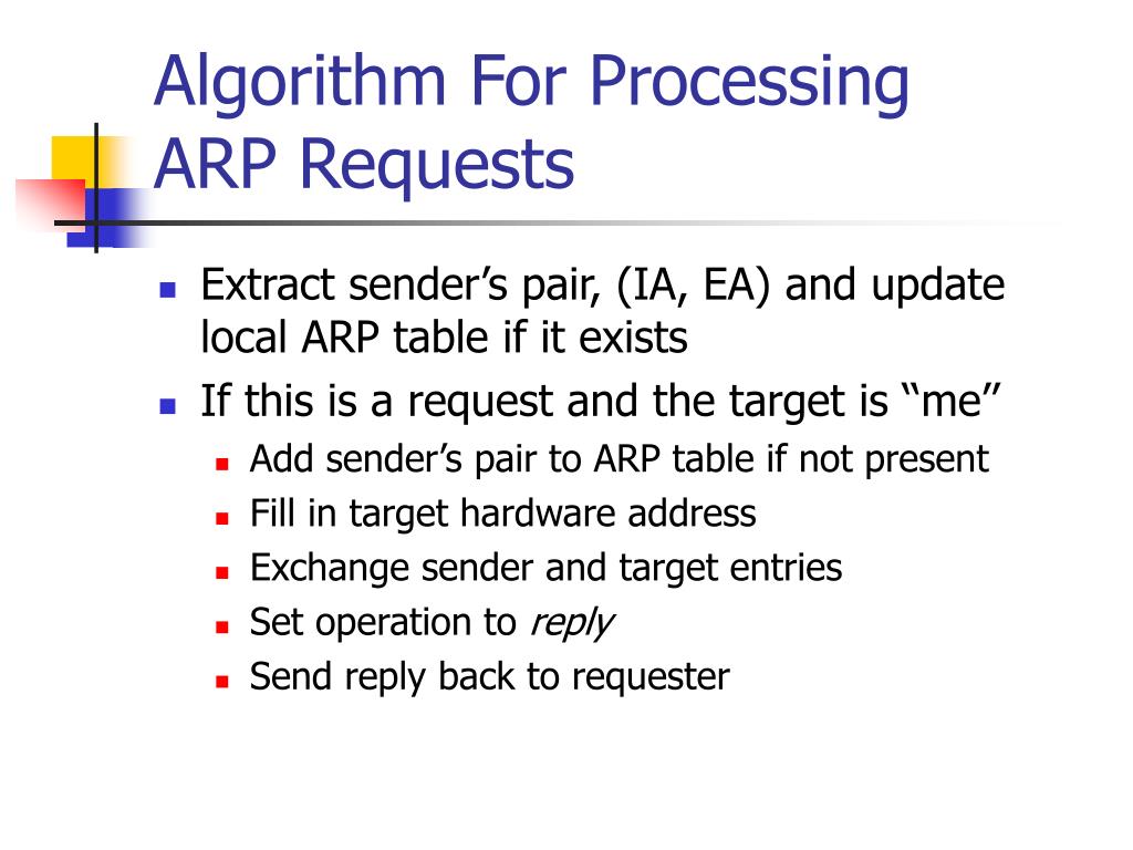 Algorithm For ProcessingARP Requests • Extract sender’s pair, (IA, EA) and update local ARP table if it exists • If this is a request and the target is ‘‘me’’ • Add sender’s pair to ARP table if not present • Fill in target hardware address • Exchange sender and target entries • Set operation to reply • Send reply back to requester