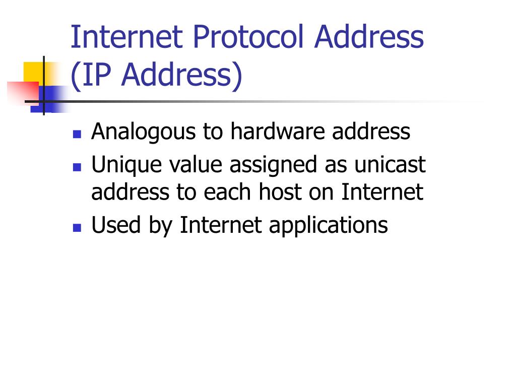 Internet Protocol Address(IP Address) • Analogous to hardware address • Unique value assigned as unicast address to each host on Internet • Used by Internet applications
