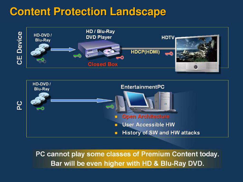 PC Output Types • DVI (Digital) • High-speed, high-quality, digital pixel interface to monitors • When protected by HDCP, it’s great for premium content • When unprotected it may be turned off for premium content • HDMI (Digital) • HDCP protection • Built by CE industry using DVI electricals • Includes digital audio, but video resolution a bit limited • VGA (Analog) • Content owners also concerned about high resolution analog • Ubiquitous, so some concessions • Information content will be ‘Constricted’ when content policy requires it • YPbPr High Resolution (Analog) • The CE industry’s first attempt at an interface to HD displays • No real protection available, less concessions (even for regular DVD) • TV-Out interfaces • Analog SD component, S-Video, composite, & TV modulated • Macrovision and CGMS-A required or else output will be disabled for premium content