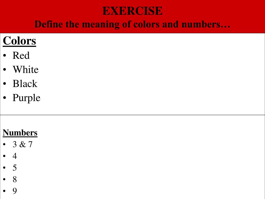 EXERCISEDefine the meaning of colors and numbers… Colors • Red • White • Black • Purple • Numbers • 3 & 7 • 4 • 5 • 8 • 9
