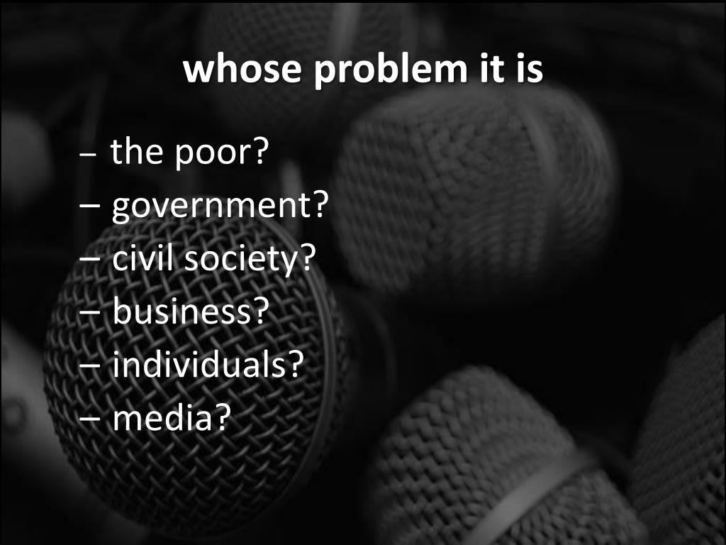 whose problem it is • the poor? • government? • civil society? • business? • individuals? • media?