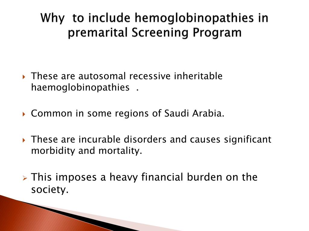 Why to include hemoglobinopathies in premarital Screening Program • These are autosomal recessive inheritable haemoglobinopathies . • Common in some regions of Saudi Arabia. • These are incurable disorders and causes significant morbidity and mortality. • This imposes a heavy financial burden on the society.