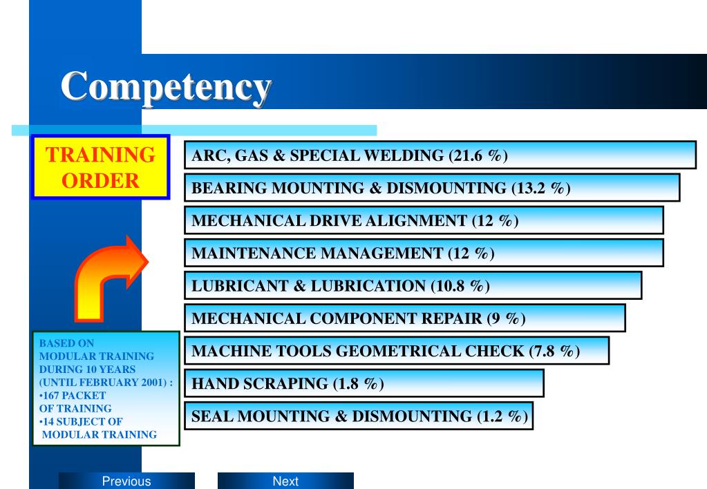PREPARE BY DUDDY ARISANDI, S.T. (JULY'01) • Instructions: • Delete sample document icon and replace with working document icons as follows: • Create document in Word. • Return to PowerPoint. • From Insert Menu, select Object… • Click “Create from File” • Locate File name in “File” box • Make sure “Display as Icon” is checked. • Click OK • Select icon • From Slide Show Menu, Select Action Settings. • Click “Object Action” and select “Edit” • Click OK Competency TRAINING ORDER ARC, GAS & SPECIAL WELDING (21.6 %) BEARING MOUNTING & DISMOUNTING (13.2 %) MECHANICAL DRIVE ALIGNMENT (12 %) MAINTENANCE MANAGEMENT (12 %) LUBRICANT & LUBRICATION (10.8 %) MECHANICAL COMPONENT REPAIR (9 %) • BASED ON • MODULAR TRAINING • DURING 10 YEARS • (UNTIL FEBRUARY 2001) : • 167 PACKET • OF TRAINING • 14 SUBJECT OF • MODULAR TRAINING MACHINE TOOLS GEOMETRICAL CHECK (7.8 %) HAND SCRAPING (1.8 %) SEAL MOUNTING & DISMOUNTING (1.2 %)