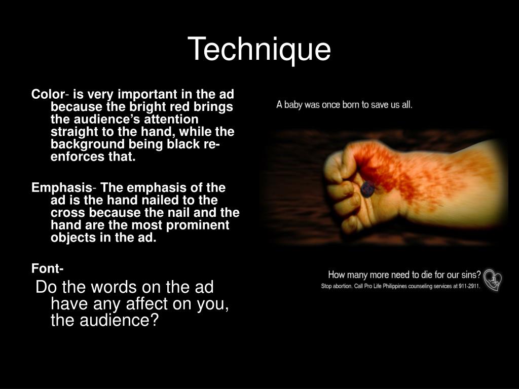 Technique Color- is very important in the ad because the bright red brings the audience’s attention straight to the hand, while the background being black re-enforces that. Emphasis- The emphasis of the ad is the hand nailed to the cross because the nail and the hand are the most prominent objects in the ad. Font- Do the words on the ad have any affect on you, the audience? To me, the words make me aware of the ad’s point, but the picture itself had the most impact.