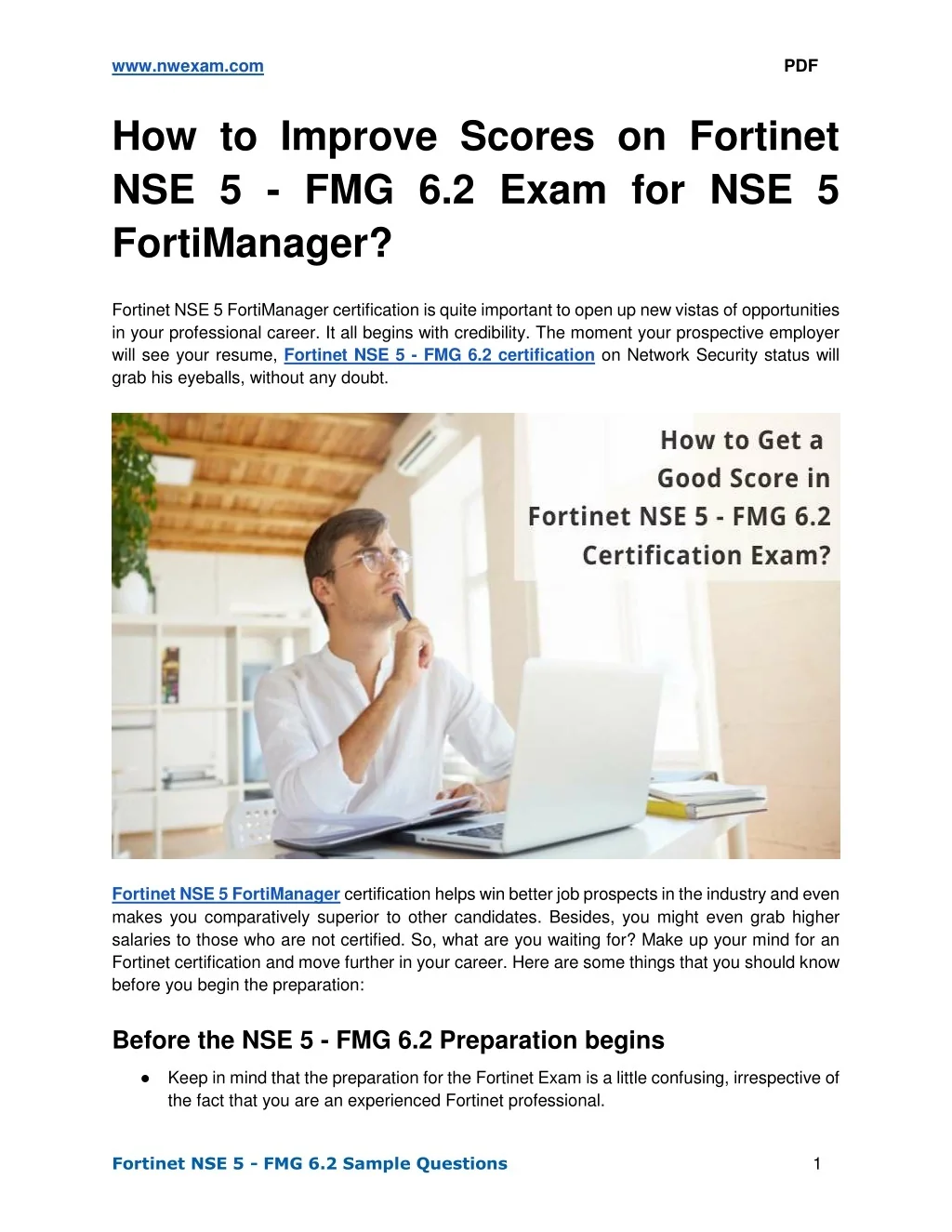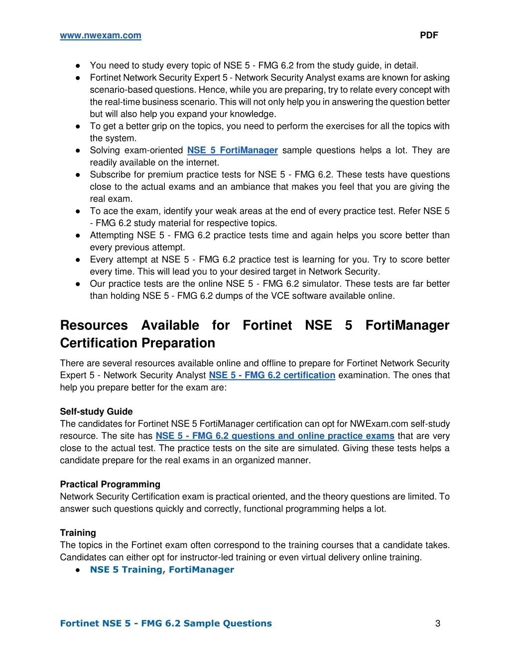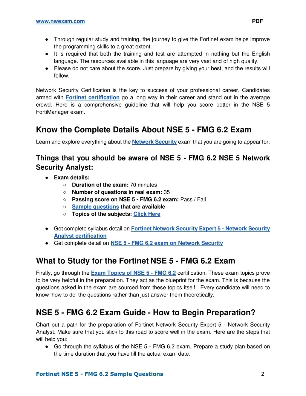 www.nwexam.com PDF ● Through regular study and training, the journey to give the Fortinet exam helps improve the programming skills to a great extent. ● It is required that both the training and test are attempted in nothing but the English language. The resources available in this language are very vast and of high quality. ● Please do not care about the score. Just prepare by giving your best, and the results will follow. Network Security Certification is the key to success of your professional career. Candidates armed with Fortinet certification go a long way in their career and stand out in the average crowd. Here is a comprehensive guideline that will help you score better in the NSE 5 FortiManager exam. Know the Complete Details About NSE 5 - FMG 6.2 Exam Learn and explore everything about the Network Security exam that you are going to appear for. Things that you should be aware of NSE 5 - FMG 6.2 NSE 5 Network Security Analyst: ●Exam details: ○Duration of the exam: 70 minutes ○Number of questions in real exam: 35 ○Passing score on NSE 5 - FMG 6.2 exam: Pass / Fail ○Sample questions that are available ○Topics of the subjects: Click Here ● Get complete syllabus detail on Fortinet Network Security Expert 5 - Network Security Analyst certification ● Get complete detail on NSE 5 - FMG 6.2 exam on Network Security What to Study for the FortinetNSE 5 - FMG 6.2 Exam Firstly, go through the Exam Topics of NSE 5 - FMG 6.2 certification. These exam topics prove to be very helpful in the preparation. They act as the blueprint for the exam. This is because the questions asked in the exam are sourced from these topics itself. Every candidate will need to know ‘how to do’ the questions rather than just answer them theoretically. NSE 5 - FMG 6.2 Exam Guide - How to Begin Preparation? Chart out a path for the preparation of Fortinet Network Security Expert 5 - Network Security Analyst. Make sure that you stick to this road to score well in the exam. Here are the steps that will help you: ● Go through the syllabus of the NSE 5 - FMG 6.2 exam. Prepare a study plan based on the time duration that you have till the actual exam date. Fortinet NSE 5 - FMG 6.2 Sample Questions 2