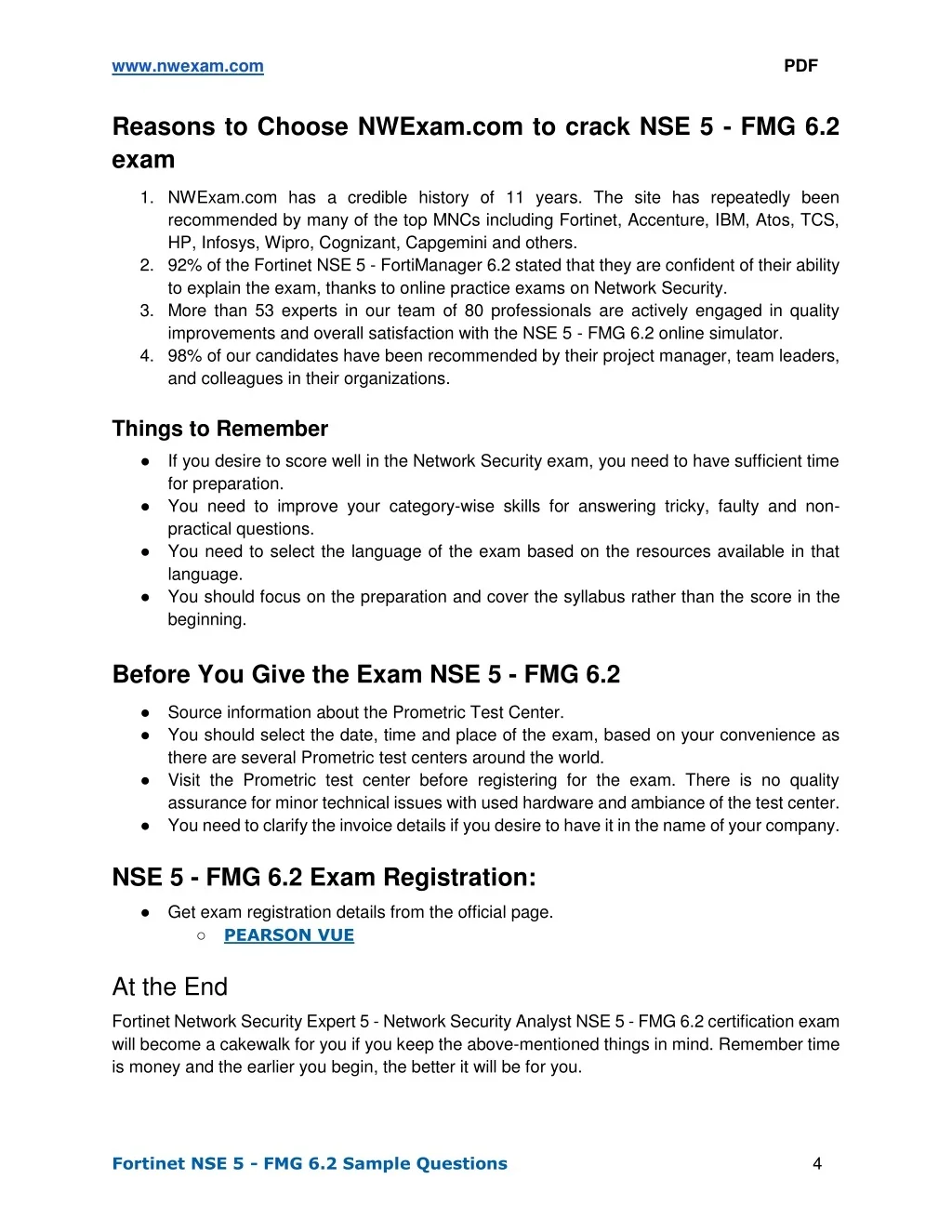 www.nwexam.com PDF ● You need to study every topic of NSE 5 - FMG 6.2 from the study guide, in detail. ● Fortinet Network Security Expert 5 - Network Security Analyst exams are known for asking scenario-based questions. Hence, while you are preparing, try to relate every concept with the real-time business scenario. This will not only help you in answering the question better but will also help you expand your knowledge. ● To get a better grip on the topics, you need to perform the exercises for all the topics with the system. ● Solving exam-oriented NSE 5 FortiManager sample questions helps a lot. They are readily available on the internet. ● Subscribe for premium practice tests for NSE 5 - FMG 6.2. These tests have questions close to the actual exams and an ambiance that makes you feel that you are giving the real exam. ● To ace the exam, identify your weak areas at the end of every practice test. Refer NSE 5 - FMG 6.2 study material for respective topics. ● Attempting NSE 5 - FMG 6.2 practice tests time and again helps you score better than every previous attempt. ● Every attempt at NSE 5 - FMG 6.2 practice test is learning for you. Try to score better every time. This will lead you to your desired target in Network Security. ● Our practice tests are the online NSE 5 - FMG 6.2 simulator. These tests are far better than holding NSE 5 - FMG 6.2 dumps of the VCE software available online. Resources Available for Fortinet NSE 5 FortiManager Certification Preparation There are several resources available online and offline to prepare for Fortinet Network Security Expert 5 - Network Security Analyst NSE 5 - FMG 6.2 certification examination. The ones that help you prepare better for the exam are: Self-study Guide The candidates for Fortinet NSE 5 FortiManager certification can opt for NWExam.com self-study resource. The site has NSE 5 - FMG 6.2 questions and online practice exams that are very close to the actual test. The practice tests on the site are simulated. Giving these tests helps a candidate prepare for the real exams in an organized manner. Practical Programming Network Security Certification exam is practical oriented, and the theory questions are limited. To answer such questions quickly and correctly, functional programming helps a lot. Training The topics in the Fortinet exam often correspond to the training courses that a candidate takes. Candidates can either opt for instructor-led training or even virtual delivery online training. ●NSE 5 Training, FortiManager Fortinet NSE 5 - FMG 6.2 Sample Questions 3
