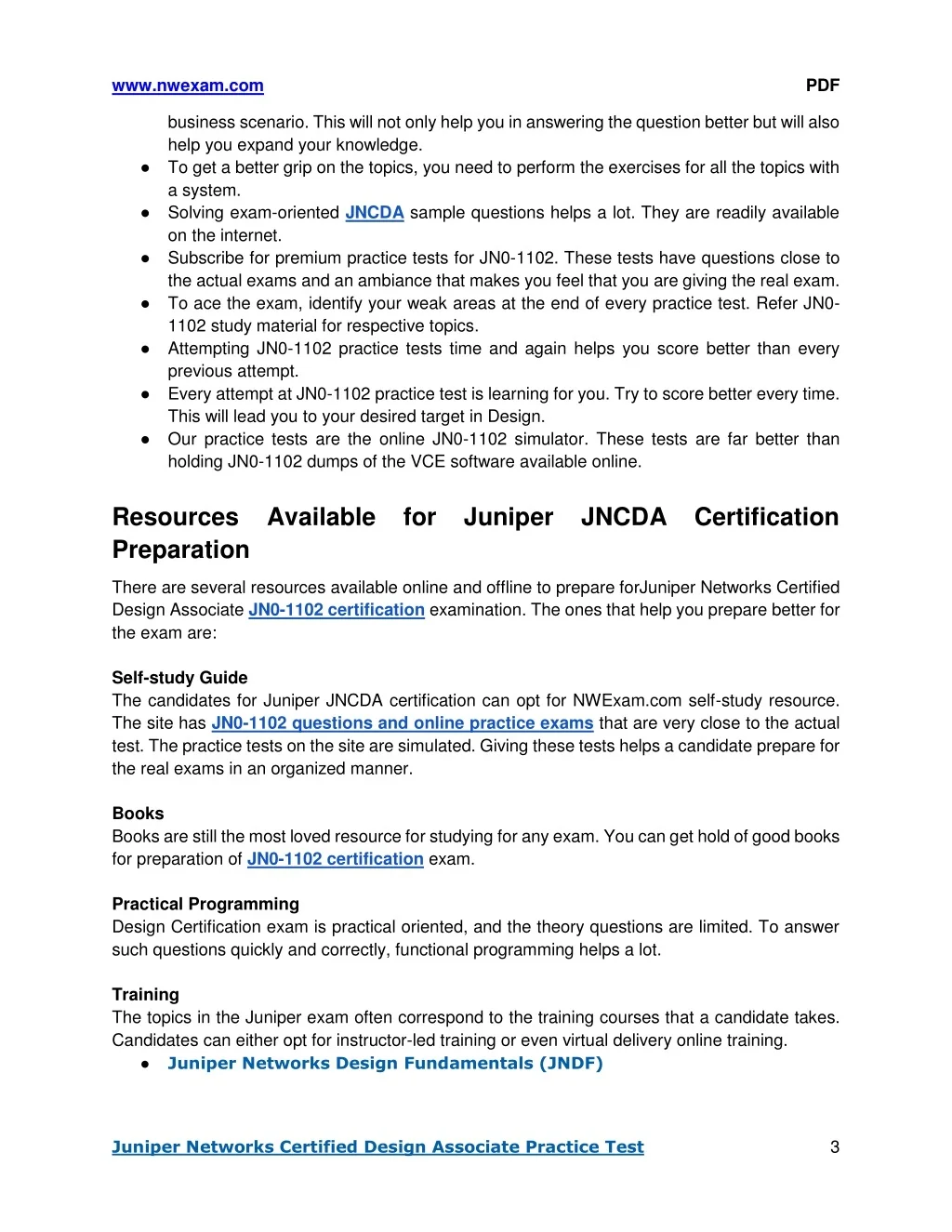 www.nwexam.com PDF business scenario. This will not only help you in answering the question better but will also help you expand your knowledge. ● To get a better grip on the topics, you need to perform the exercises for all the topics with a system. ● Solving exam-oriented JNCDA sample questions helps a lot. They are readily available on the internet. ● Subscribe for premium practice tests for JN0-1102. These tests have questions close to the actual exams and an ambiance that makes you feel that you are giving the real exam. ● To ace the exam, identify your weak areas at the end of every practice test. Refer JN0- 1102 study material for respective topics. ● Attempting JN0-1102 practice tests time and again helps you score better than every previous attempt. ● Every attempt at JN0-1102 practice test is learning for you. Try to score better every time. This will lead you to your desired target in Design. ● Our practice tests are the online JN0-1102 simulator. These tests are far better than holding JN0-1102 dumps of the VCE software available online. Resources Available for Juniper JNCDA Certification Preparation There are several resources available online and offline to prepare forJuniper Networks Certified Design Associate JN0-1102 certification examination. The ones that help you prepare better for the exam are: Self-study Guide The candidates for Juniper JNCDA certification can opt for NWExam.com self-study resource. The site has JN0-1102 questions and online practice exams that are very close to the actual test. The practice tests on the site are simulated. Giving these tests helps a candidate prepare for the real exams in an organized manner. Books Books are still the most loved resource for studying for any exam. You can get hold of good books for preparation of JN0-1102 certification exam. Practical Programming Design Certification exam is practical oriented, and the theory questions are limited. To answer such questions quickly and correctly, functional programming helps a lot. Training The topics in the Juniper exam often correspond to the training courses that a candidate takes. Candidates can either opt for instructor-led training or even virtual delivery online training. ●Juniper Networks Design Fundamentals (JNDF) Juniper Networks Certified Design Associate Practice Test 3