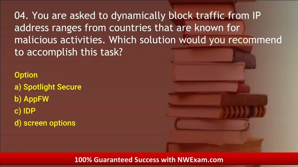 04. 04. You are asked to dynamically block traffic from IP address ranges from countries that are known for malicious activities. Which solution would you recommend to accomplish this task? Option Option a) Spotlight Secure b) AppFW c) IDP d) screen options 100% Guaranteed Success with NWExam.com 100% Guaranteed Success with NWExam.com
