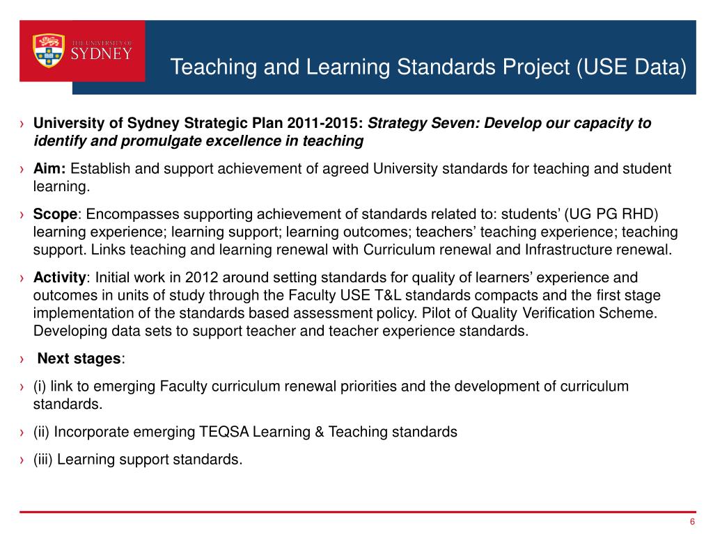 Teaching and Learning Standards Project (USE Data) • University of Sydney Strategic Plan 2011-2015: Strategy Seven: Develop our capacity to identify and promulgate excellence in teaching • Aim: Establish and support achievement of agreed University standards for teaching and student learning. • Scope: Encompasses supporting achievement of standards related to: students’ (UG PG RHD) learning experience; learning support; learning outcomes; teachers’ teaching experience; teaching support. Links teaching and learning renewal with Curriculum renewal and Infrastructure renewal. • Activity: Initial work in 2012 around setting standards for quality of learners’ experience and outcomes in units of study through the Faculty USE T&L standards compacts and the first stage implementation of the standards based assessment policy. Pilot of Quality Verification Scheme. Developing data sets to support teacher and teacher experience standards. • Next stages: • (i) link to emerging Faculty curriculum renewal priorities and the development of curriculum standards. • (ii) Incorporate emerging TEQSA Learning & Teaching standards • (iii) Learning support standards.