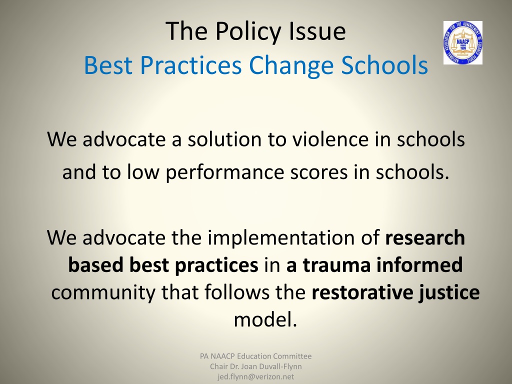 The Policy IssueBest Practices Change Schools We advocate a solution to violence in schools and to low performance scores in schools. We advocate the implementation of research based best practices in a trauma informed community that follows the restorative justice model. PA NAACP Education Committee Chair Dr. Joan Duvall-Flynn jed.flynn@verizon.net