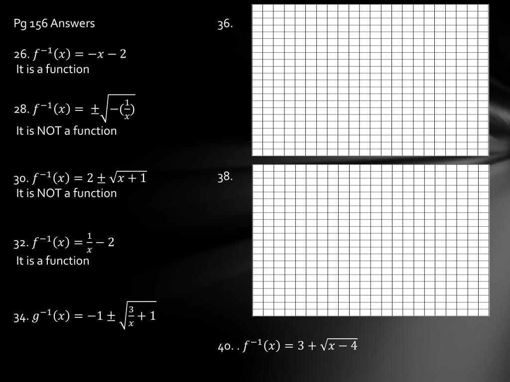 Pg 156 Answers 26. It is a function 28. It is NOT a function 30. It is NOT a function 32. It is a function 34. 36. 38. 40. .