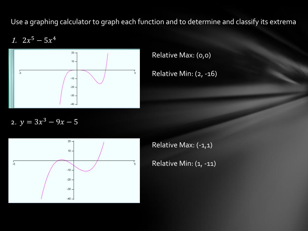 Use a graphing calculator to graph each function and to determine and classify its extrema Relative Max: (0,0) Relative Min: (2, -16) 2. Relative Max: (-1,1) Relative Min: (1, -11)