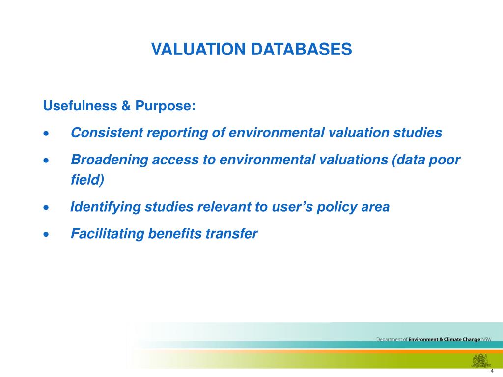 VALUATION DATABASES Usefulness & Purpose: • Consistent reporting of environmental valuation studies • Broadening access to environmental valuations (data poor field) • Identifying studies relevant to user’s policy area • Facilitating benefits transfer