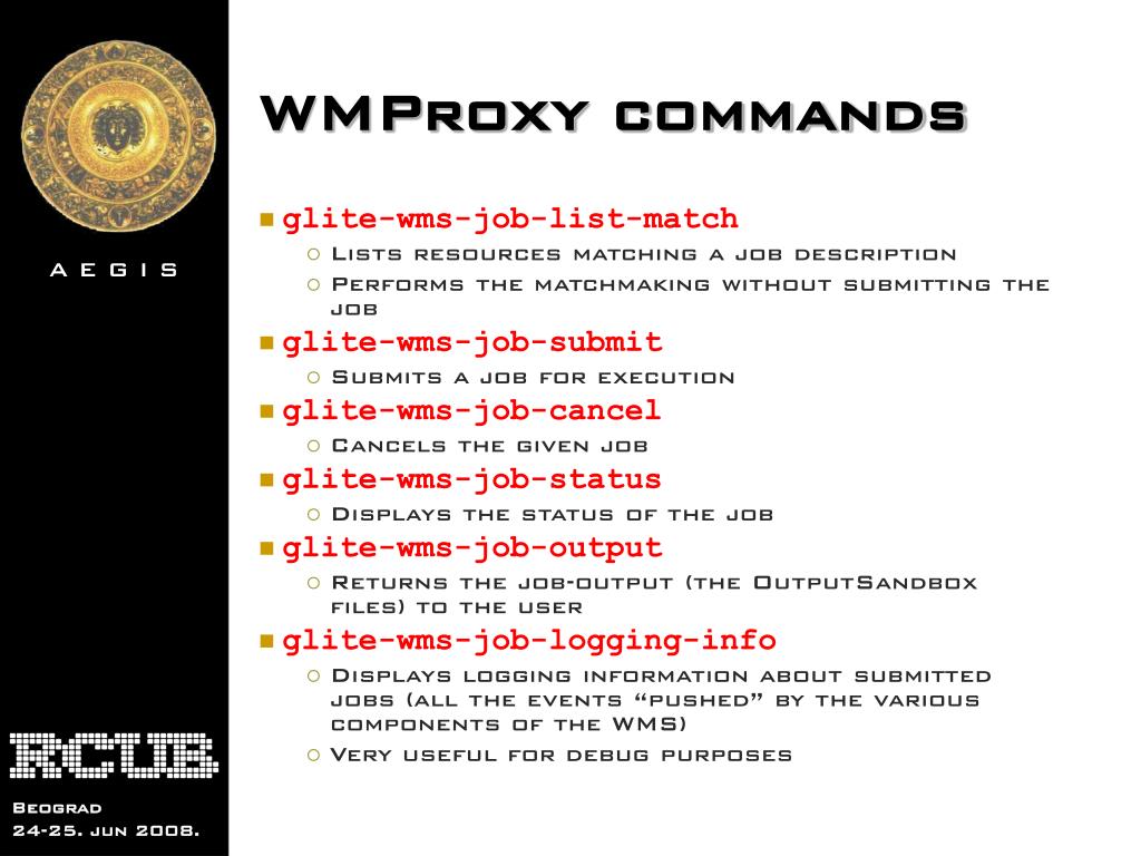WMProxy commands • glite-wms-job-list-match • Lists resources matching a job description • Performs the matchmaking without submitting the job • glite-wms-job-submit • Submits a job for execution • glite-wms-job-cancel • Cancels the given job • glite-wms-job-status • Displays the status of the job • glite-wms-job-output • Returns the job-output (the OutputSandbox files) to the user • glite-wms-job-logging-info • Displays logging information about submitted jobs (all the events “pushed” by the various components of the WMS) • Very useful for debug purposes