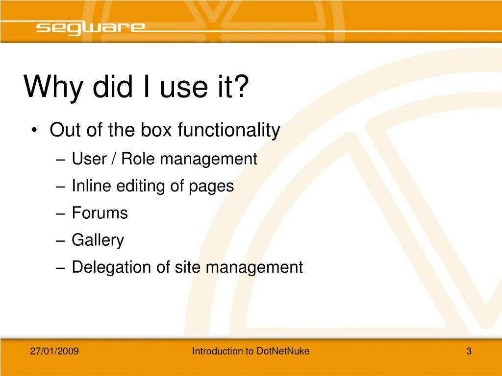 Why did I use it? • Out of the box functionality • User / Role management • Inline editing of pages • Forums • Gallery • Delegation of site management Introduction to DotNetNuke