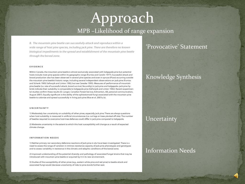 Approach ‘Provocative’ Statement MPB –Likelihood of range expansion Knowledge Synthesis Uncertainty Information Needs