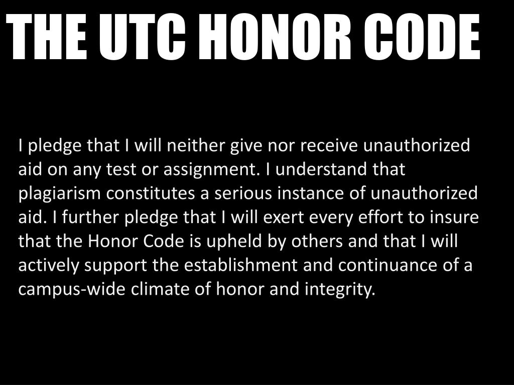 I pledge that I will neither give nor receive unauthorized aid on any test or assignment. I understand that plagiarism constitutes a serious instance of unauthorized aid. I further pledge that I will exert every effort to insure that the Honor Code is upheld by others and that I will actively support the establishment and continuance of a campus-wide climate of honor and integrity. THE UTC HONOR CODE