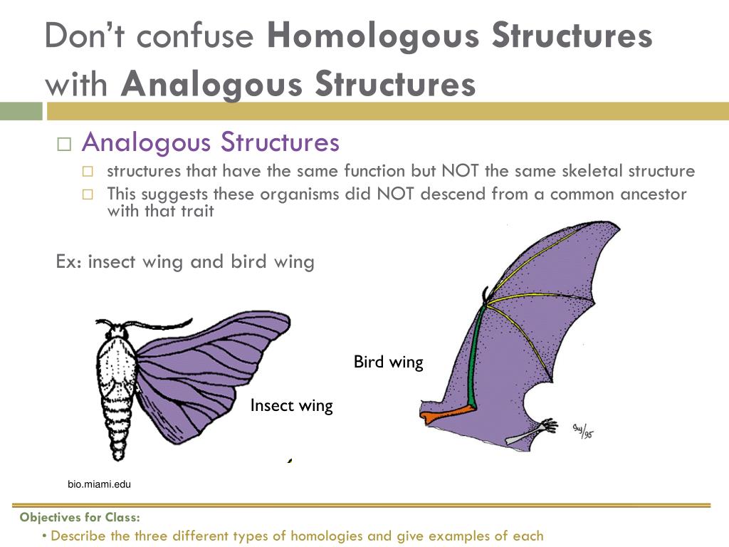 Don’t confuse Homologous Structures with Analogous Structures • Analogous Structures • structures that have the same function but NOT the same skeletal structure • This suggests these organisms did NOT descend from a common ancestor with that trait Ex: insect wing and bird wing Bird wing Insect wing • Objectives for Class: • Describe the three different types of homologies and give examples of each bio.miami.edu