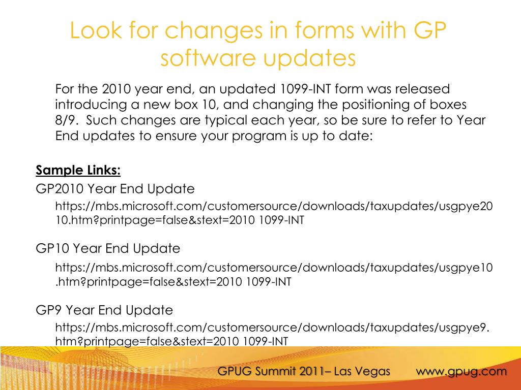 Look for changes in forms with GP software updates For the 2010 year end, an updated 1099-INT form was released introducing a new box 10, and changing the positioning of boxes 8/9. Such changes are typical each year, so be sure to refer to Year End updates to ensure your program is up to date: Sample Links: GP2010 Year End Update https://mbs.microsoft.com/customersource/downloads/taxupdates/usgpye2010.htm?printpage=false&stext=2010 1099-INT GP10 Year End Update https://mbs.microsoft.com/customersource/downloads/taxupdates/usgpye10.htm?printpage=false&stext=2010 1099-INT GP9 Year End Update https://mbs.microsoft.com/customersource/downloads/taxupdates/usgpye9.htm?printpage=false&stext=2010 1099-INT