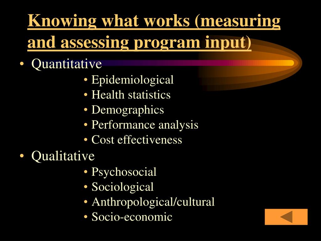 Knowing what works (measuring and assessing program input) • Quantitative • Epidemiological • Health statistics • Demographics • Performance analysis • Cost effectiveness • Qualitative • Psychosocial • Sociological • Anthropological/cultural • Socio-economic