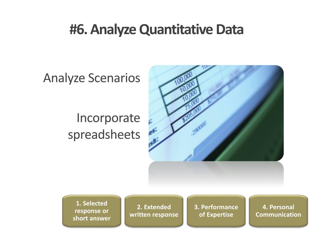 #6. Analyze Quantitative Data 1. Selected response or short answer 2. Extended written response 3. Performance of Expertise 4. Personal Communication Analyze Scenarios Incorporate spreadsheets