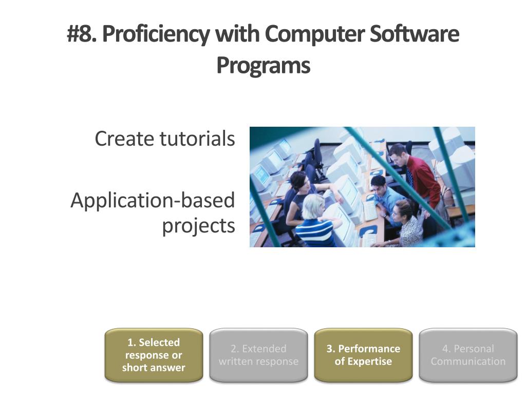 #8. Proficiency with Computer Software Programs 1. Selected response or short answer 2. Extended written response 3. Performance of Expertise 4. Personal Communication Create tutorials Application-based projects