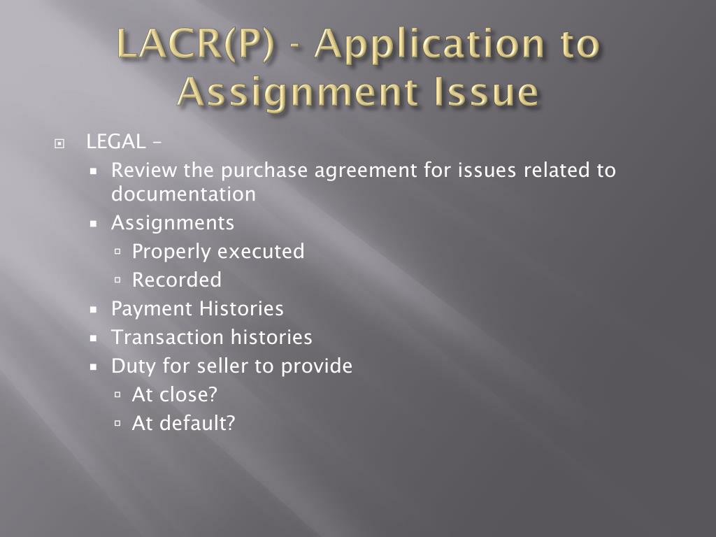 LACR(P) - Application to Assignment Issue • LEGAL – • Review the purchase agreement for issues related to documentation • Assignments • Properly executed • Recorded • Payment Histories • Transaction histories • Duty for seller to provide • At close? • At default?