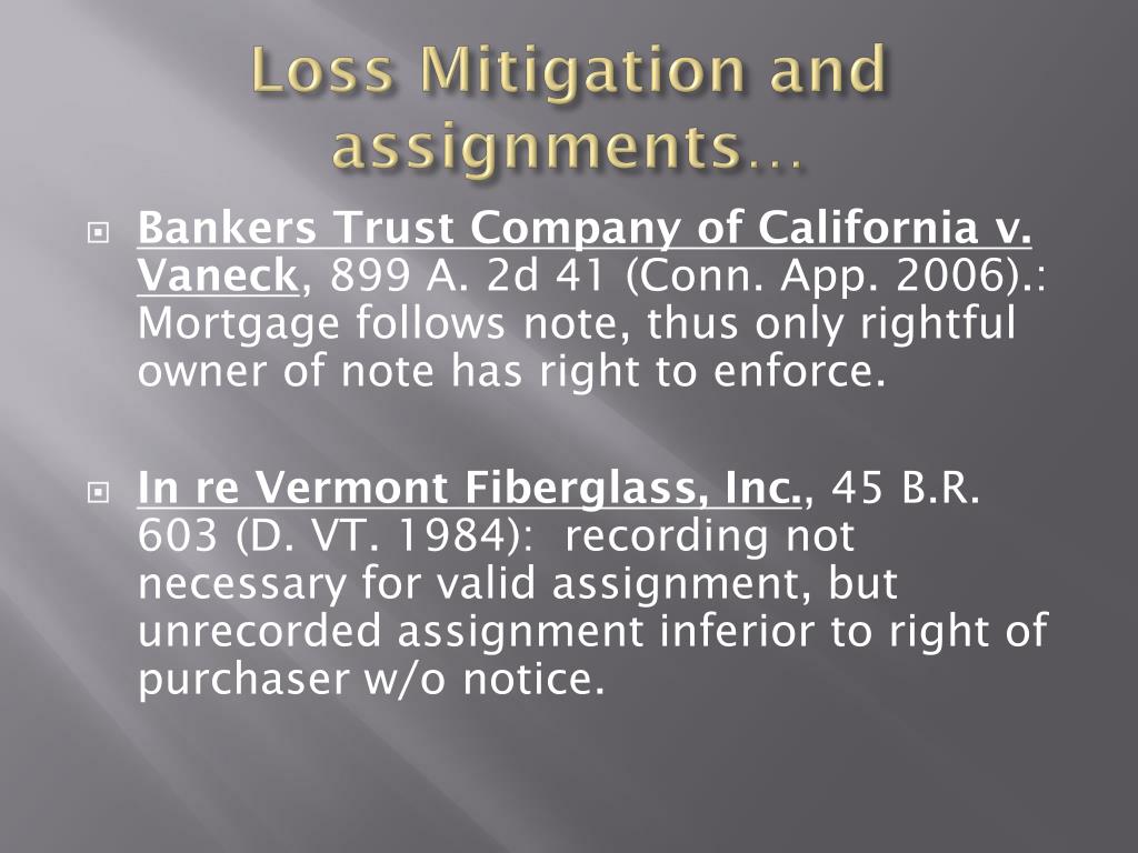 Loss Mitigation and assignments… • Bankers Trust Company of California v. Vaneck, 899 A. 2d 41 (Conn. App. 2006).: Mortgage follows note, thus only rightful owner of note has right to enforce. • In re Vermont Fiberglass, Inc., 45 B.R. 603 (D. VT. 1984): recording not necessary for valid assignment, but unrecorded assignment inferior to right of purchaser w/o notice.