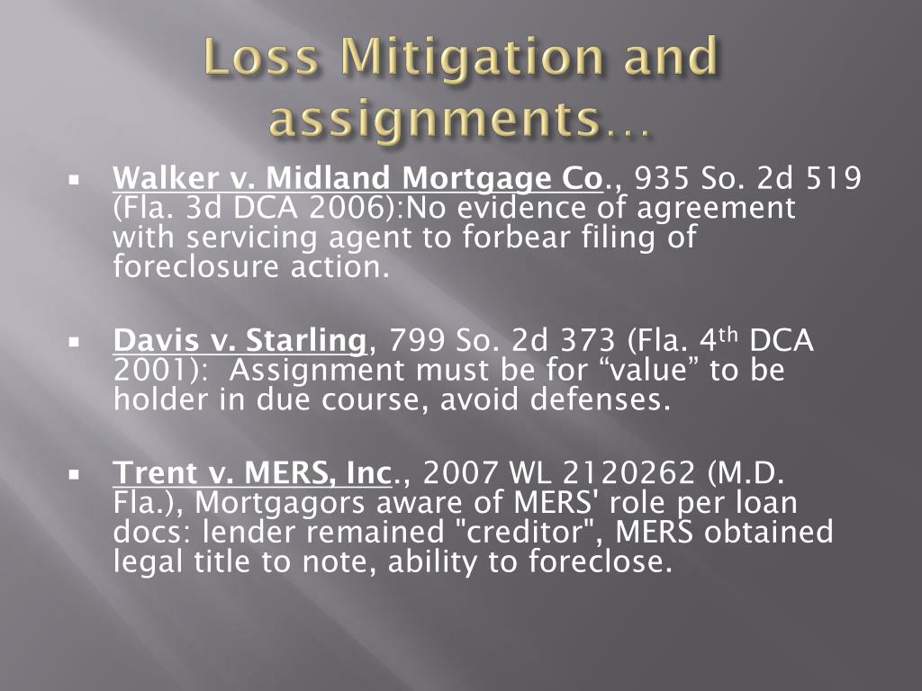 Loss Mitigation and assignments… • Walker v. Midland Mortgage Co., 935 So. 2d 519 (Fla. 3d DCA 2006):No evidence of agreement with servicing agent to forbear filing of foreclosure action. • Davis v. Starling, 799 So. 2d 373 (Fla. 4th DCA 2001): Assignment must be for “value” to be holder in due course, avoid defenses. • Trent v. MERS, Inc., 2007 WL 2120262 (M.D. Fla.), Mortgagors aware of MERS' role per loan docs: lender remained "creditor", MERS obtained legal title to note, ability to foreclose.