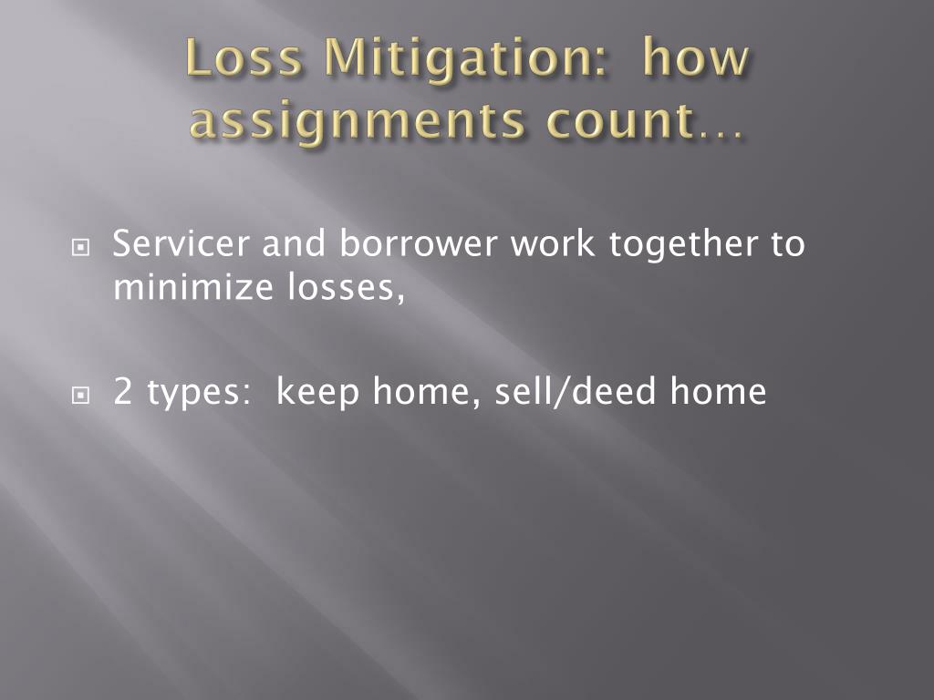 Loss Mitigation: how assignments count… • Servicer and borrower work together to minimize losses, • 2 types: keep home, sell/deed home