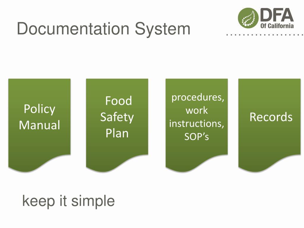 Documentation System Policy Manual Food Safety Plan procedures, work instructions, SOP’s Records keep it simple