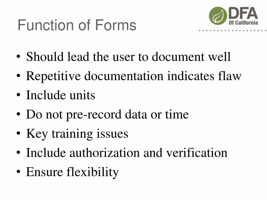 Function of Forms • Should lead the user to document well • Repetitive documentation indicates flaw • Include units • Do not pre-record data or time • Key training issues • Include authorization and verification • Ensure flexibility
