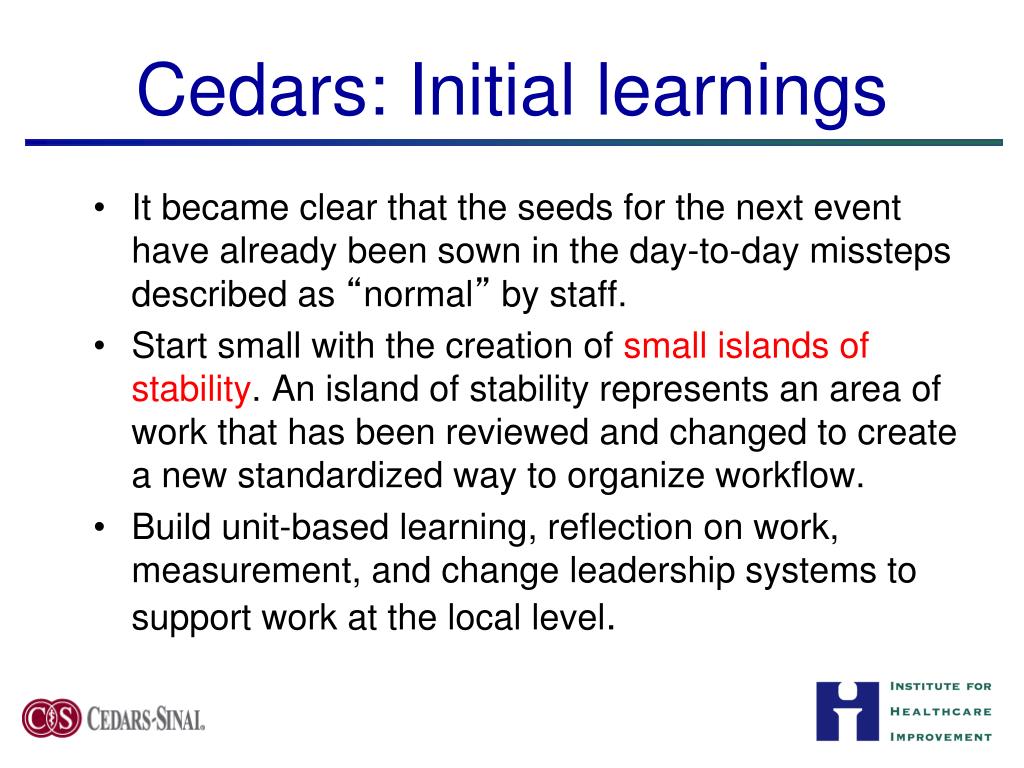 Cedars: Initial learnings • It became clear that the seeds for the next event have already been sown in the day-to-day missteps described as “normal” by staff. • Start small with the creation of small islands of stability. An island of stability represents an area of work that has been reviewed and changed to create a new standardized way to organize workflow. • Build unit-based learning, reflection on work, measurement, and change leadership systems to support work at the local level.