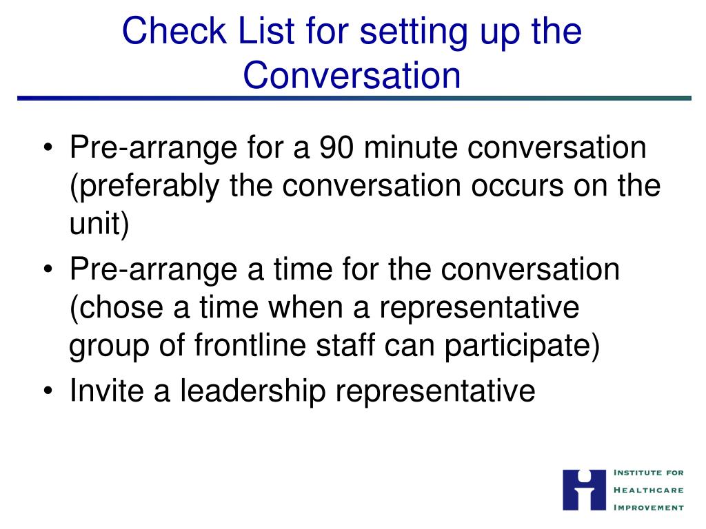 Check List for setting up the Conversation • Pre-arrange for a 90 minute conversation (preferably the conversation occurs on the unit) • Pre-arrange a time for the conversation (chose a time when a representative group of frontline staff can participate) • Invite a leadership representative