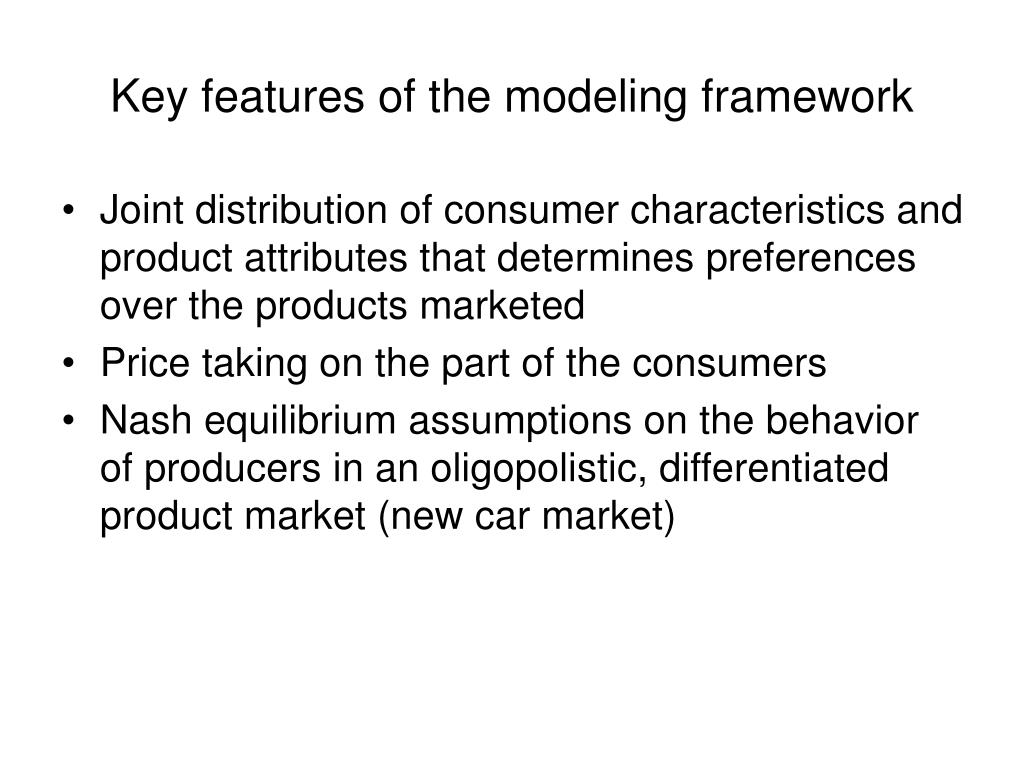 Key features of the modeling framework • Joint distribution of consumer characteristics and product attributes that determines preferences over the products marketed • Price taking on the part of the consumers • Nash equilibrium assumptions on the behavior of producers in an oligopolistic, differentiated product market (new car market)