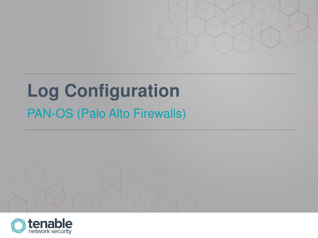 Normalized Logs • The Tenable LCE team has normalized a series of log events to support Palo Alto. • Paloalto-Allow_TCP_Start • Paloalto-Allow_TCP_End • Paloalto-Allow_UDP_Start • Paloalto-Allow_UDP_End • Paloalto-Allow_ICMP_Start • Paloalto-Allow_ICMP_End • Paloalto-Deny_TCP • Paloalto-Deny_UDP • Paloalto-Deny_ICMP • Paloalto-Deny_TCP • Paloalto-Deny_UDP • Paloalto-Deny_ICMP • Paloalto-Configuration_Edit • Paloalto-Configuration_Delete • Paloalto-Configuration_Commit • Paloalto-System_General_Msg • Paloalto-Threat_Spyware • Paloalto-Threat_URL • Paloalto-Threat_Vulnerability • Paloalto-Threat_File • Paloalto-Threat_Virus • Paloalto-Authentication_Failed • Paloalto-Authentication_Failed_Threshold_Reached