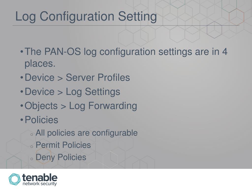 Log Configuration Setting • The PAN-OS log configuration settings are in 4 places. • Device > Server Profiles • Device > Log Settings • Objects > Log Forwarding • Policies • All policies are configurable • Permit Policies • Deny Policies