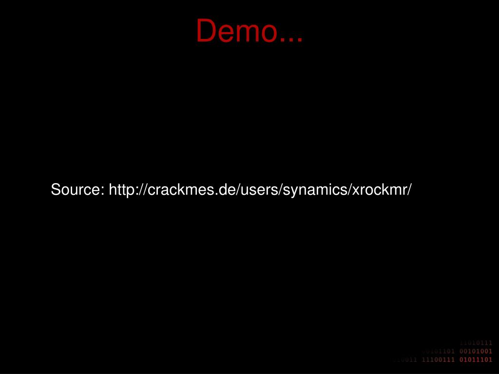 Demo... Source: http://crackmes.de/users/synamics/xrockmr/