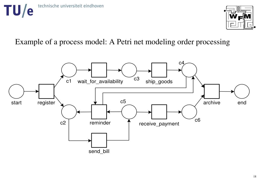 Petri nets as a basis • The process perspective is the most dominant one. • There are many modeling techniques and tools • BPEL, BPMN, DFD, ISAC, SADT, PN, HLPN, PA, FC, UML, ... • Simulation tools, design tools, CASE tools, WFMS, ... • Focus on the essential concepts rather than (system-)specific languages.