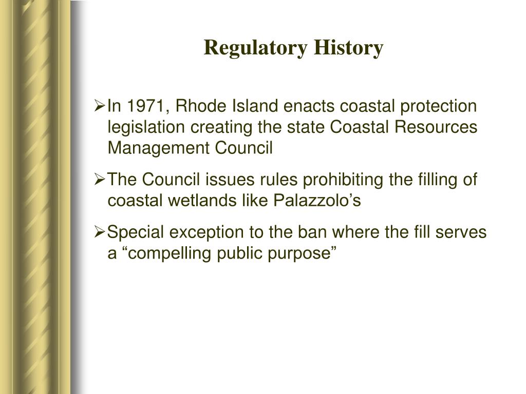 Regulatory History • In 1971, Rhode Island enacts coastal protection legislation creating the state Coastal Resources Management Council • The Council issues rules prohibiting the filling of coastal wetlands like Palazzolo’s • Special exception to the ban where the fill serves a “compelling public purpose”