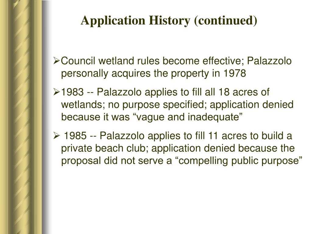 Application History (continued) • Council wetland rules become effective; Palazzolo personally acquires the property in 1978 • 1983 -- Palazzolo applies to fill all 18 acres of wetlands; no purpose specified; application denied because it was “vague and inadequate” • 1985 -- Palazzolo applies to fill 11 acres to build a private beach club; application denied because the proposal did not serve a “compelling public purpose”