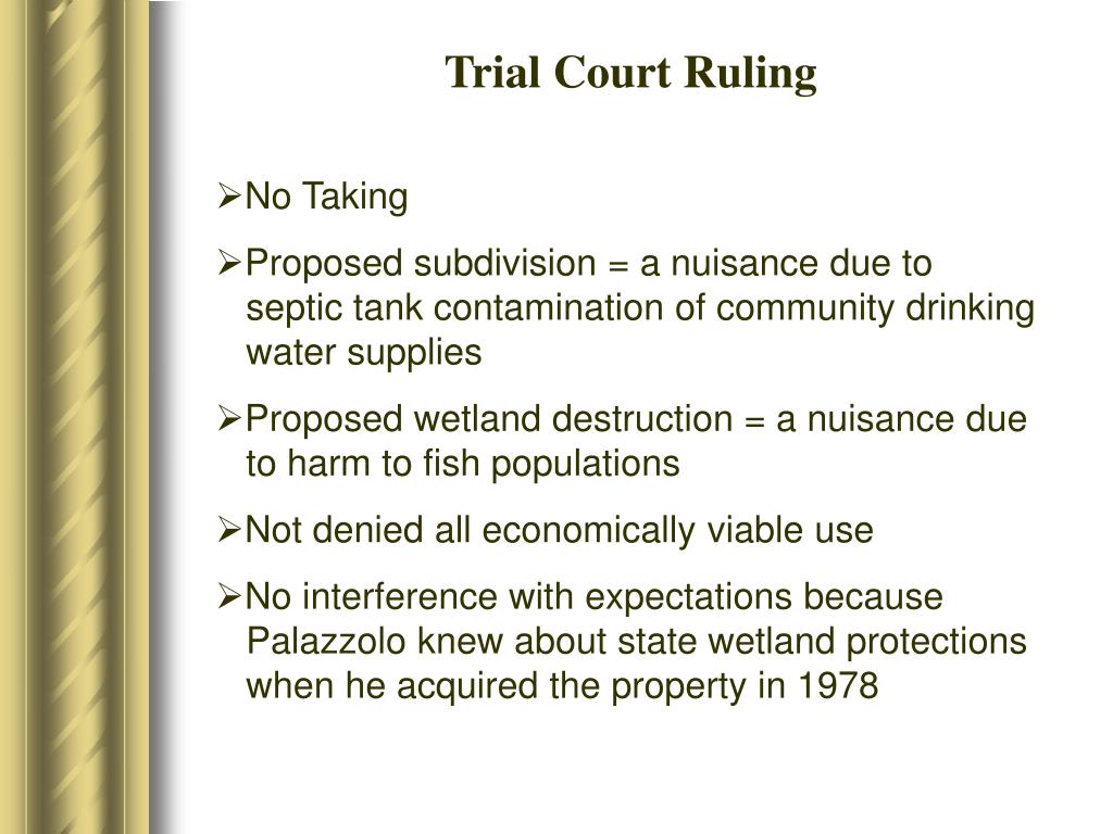 Trial Court Ruling • No Taking • Proposed subdivision = a nuisance due to septic tank contamination of community drinking water supplies • Proposed wetland destruction = a nuisance due to harm to fish populations • Not denied all economically viable use • No interference with expectations because Palazzolo knew about state wetland protections when he acquired the property in 1978