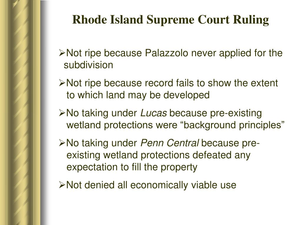 Rhode Island Supreme Court Ruling • Not ripe because Palazzolo never applied for the subdivision • Not ripe because record fails to show the extent to which land may be developed • No taking under Lucas because pre-existing wetland protections were “background principles” • No taking under Penn Central because pre- existing wetland protections defeated any expectation to fill the property • Not denied all economically viable use