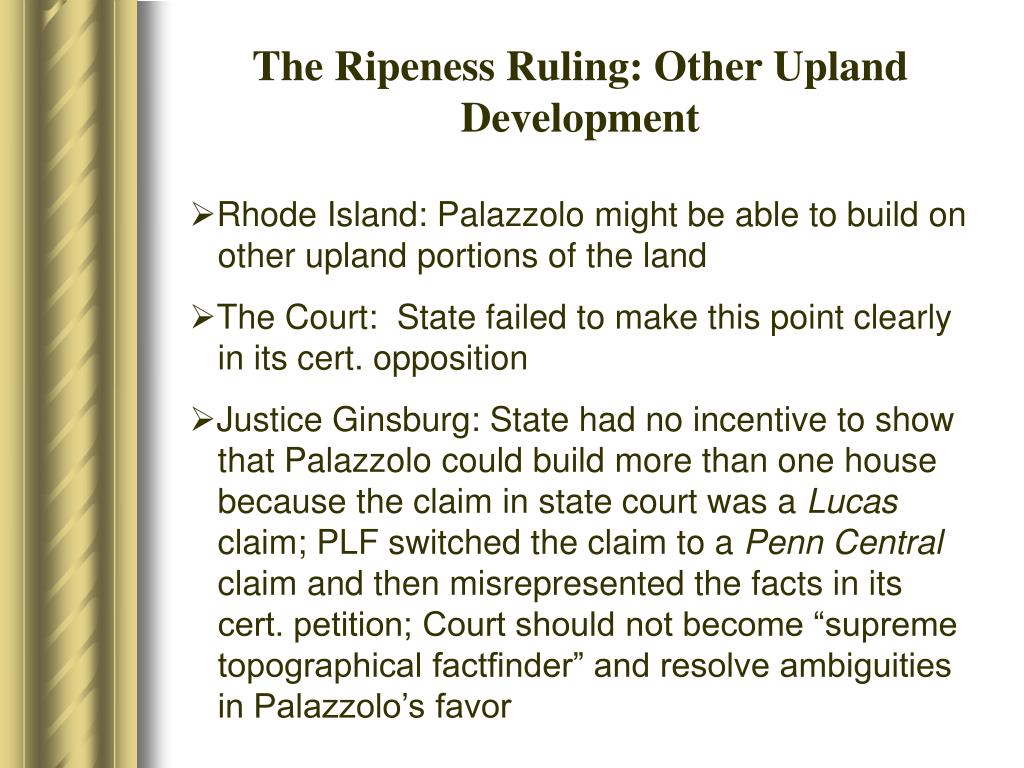 The Ripeness Ruling: Other Upland Development • Rhode Island: Palazzolo might be able to build on other upland portions of the land • The Court: State failed to make this point clearly in its cert. opposition • Justice Ginsburg: State had no incentive to show that Palazzolo could build more than one house because the claim in state court was a Lucas claim; PLF switched the claim to a Penn Central claim and then misrepresented the facts in its cert. petition; Court should not become “supreme topographical factfinder” and resolve ambiguities in Palazzolo’s favor