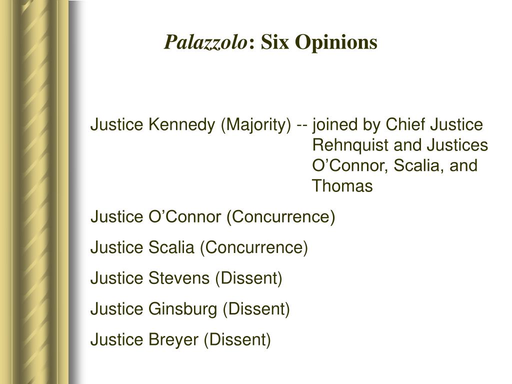 Palazzolo: Six Opinions Justice Kennedy (Majority) -- joined by Chief Justice Rehnquist and Justices O’Connor, Scalia, and Thomas Justice O’Connor (Concurrence) Justice Scalia (Concurrence) Justice Stevens (Dissent) Justice Ginsburg (Dissent) Justice Breyer (Dissent)